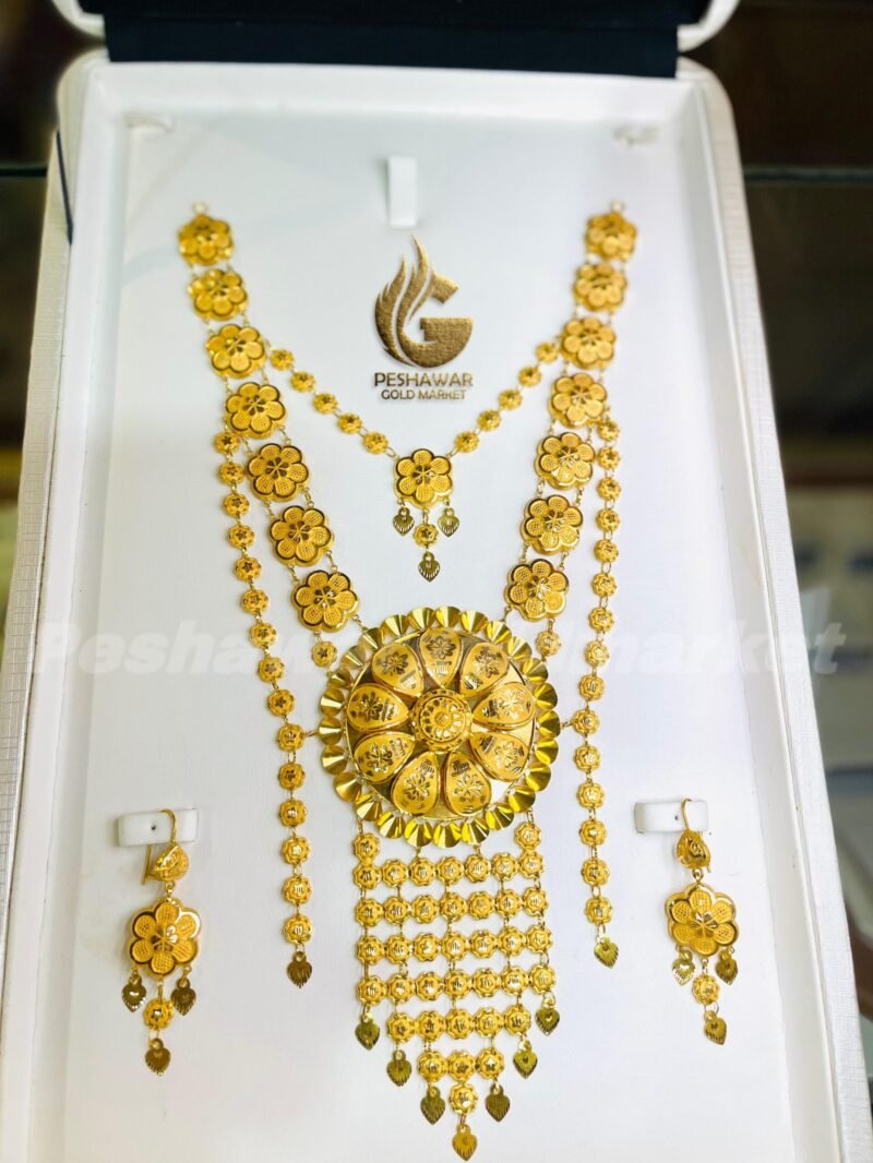 1. This exquisite gold necklace and earrings set is a stunning addition to any bridal collection, showcasing the elegance of Arabic Kuwaiti design. Weighing 40.420 grams and crafted from high-quality 21-carat gold, this set is not only a symbol of luxury but also a testament to fine craftsmanship. It comes beautifully presented in a display case, making it an ideal gift for special occasions, with a return guarantee for your peace of mind.