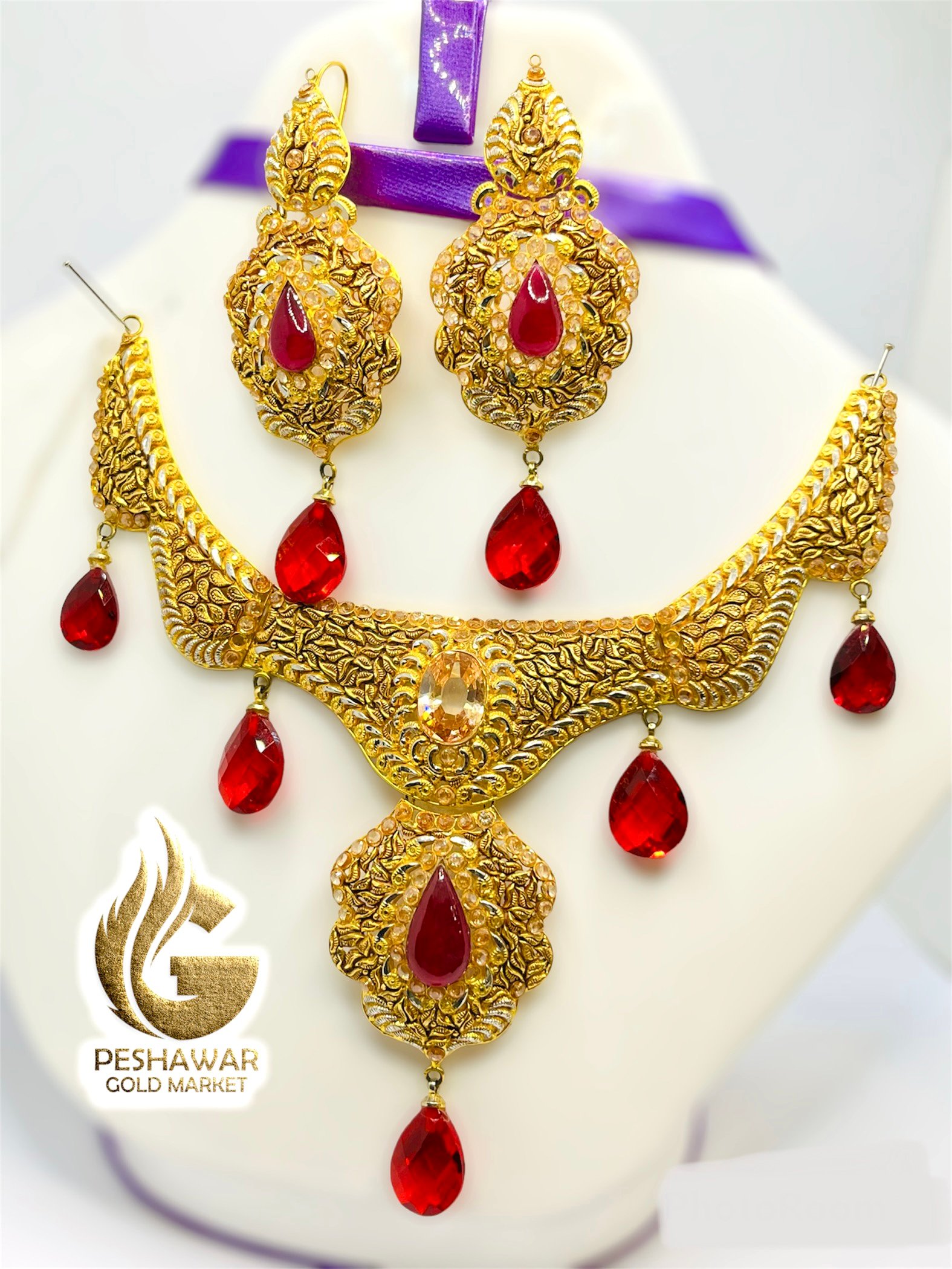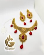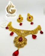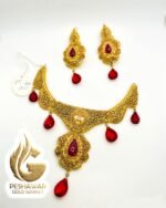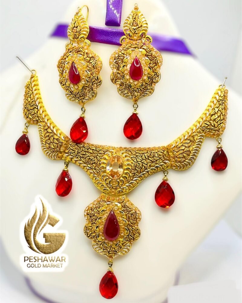 1. Introducing the exquisite Madrasi bridal set, this stunning gold necklace and earrings set is adorned with captivating red stones. Crafted with meticulous attention to detail, this set exudes elegance and sophistication, making it the perfect accessory for any special occasion. The radiant red stones add a touch of glamour and allure, enhancing the overall beauty of this timeless jewelry set. Elevate your style and make a statement with this enchanting Madrasi bridal set.
